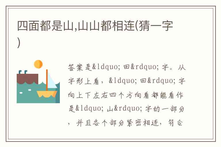 答案是“田”字。从字形上看,“田”字向上下左右四个方向看都能看作是“山”字的一部分,并且各个部分紧密相连,符合“四面都是山,山山都相连 ”的描述。