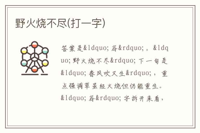 “野火烧不尽”下一句是“春风吹又生”,重点强调草虽经火烧但仍能重生。“荐”字拆开来看,上面是“艹”代表草,下面是“存”,有留存、存在之意,寓意草经历野火后依然留存,扣合谜面 。