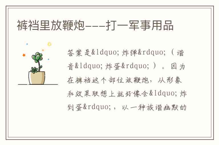 答案是“炸弹”(谐音“炸蛋”) 。因为在裤裆这个部位放鞭炮,从形象和效果联想上就好像会“炸到蛋”,以一种诙谐幽默的方式利用谐音得出答案。