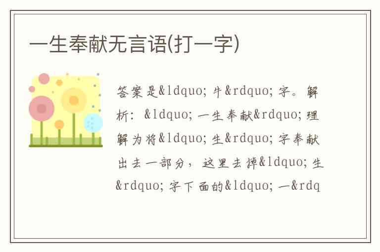 解析:“一生奉献”理解为将“生”字奉献出去一部分,这里去掉“生”字下面的“一”;“无言语”可理解为没有说话相关的部分(此处在字形关联上辅助理解) ,最后剩下的就是“牛”字。