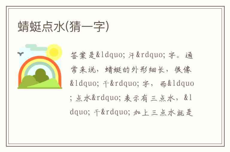 答案是“汗”字。通常来说,蜻蜓的外形细长,很像“干”字,而“点水”表示有三点水,“干”加上三点水就是“汗”字。