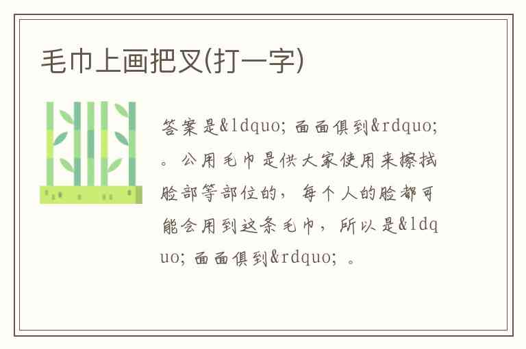 答案是“面面俱到”。公用毛巾是供大家使用来擦拭脸部等部位的,每个人的脸都可能会用到这条毛巾,所以是“面面俱到” 。