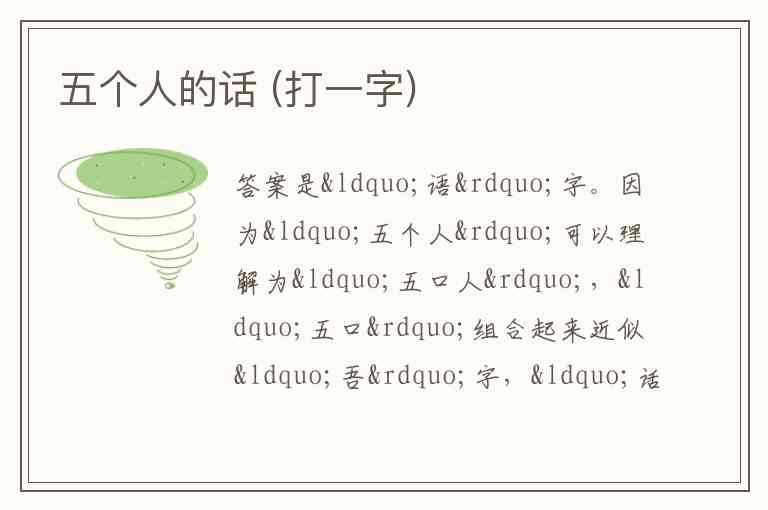答案是“语”字。因为“五个人”可以理解为“五口人”,“五口”组合起来近似“吾”字,“话”即“言”(讠),“讠”与“吾”合起来就是“语”字。