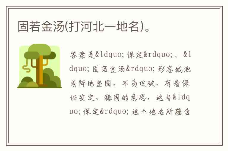 答案是“保定”。“固若金汤”形容城池或阵地坚固,不易攻破,有着保证安定、稳固的意思,这与“保定”这个地名所蕴含的意义相契合,所以谜底是河北的“保定” 。