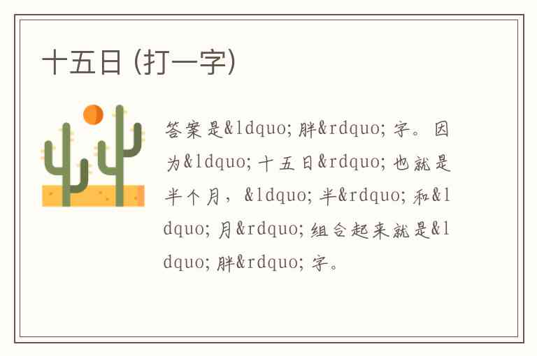 答案是“胖”字。因为“十五日”也就是半个月,“半”和“月”组合起来就是“胖”字。