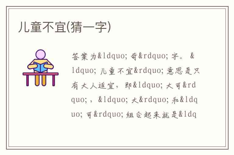 答案为“奇”字。 “儿童不宜”意思是只有大人适宜,即“大可”,“大”和“可”组合起来就是“奇”字 。