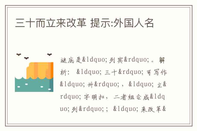 解析: “三十”可写作“卅”,“立”字明扣,二者组合成“列”;“来改革”表示改变“来”字的结构,可得到“宾”字 ,所以是“列宾”。列宾是俄国杰出的批判现实主义画家。