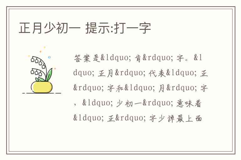 “正月”代表“正”字和“月”字,“少初一”意味着“正”字少掉最上面的“一”,这样“正”字去掉“一”后剩下“止”,再与“月”字组合,就形成了“肯”字。