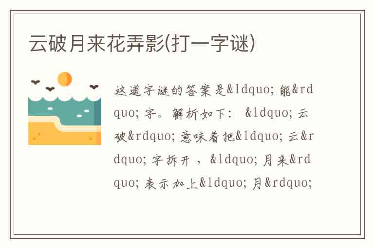 解析如下: “云破”意味着把“云”字拆开 ,“月来”表示加上“月”字。“花弄影”暗示通过某种变化得到最终字形。把“云”拆成两部分,其中一部分与“月”组合,即“厶”和“月”组合成“能”字左边部分,整体就形成了“能”字 。