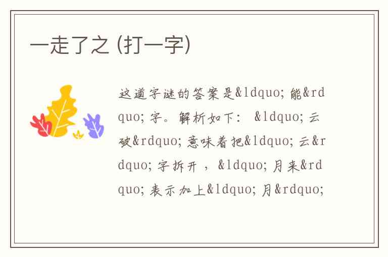 解析如下: “云破”意味着把“云”字拆开 ,“月来”表示加上“月”字。“花弄影”暗示通过某种变化得到最终字形。把“云”拆成两部分,其中一部分与“月”组合,即“厶”和“月”组合成“能”字左边部分,整体就形成了“能”字 。