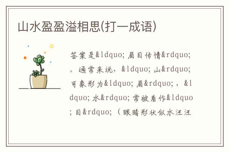 通常来说,“山”可象形为“眉”,“水”常被看作“目”(眼睛形状似水汪汪) ,“盈盈”描绘出一种含情的状态,“溢相思”则突出情感的传递,整体扣合“眉目传情”这个成语,表示用眉眼的活动向对方表达自己的情意。