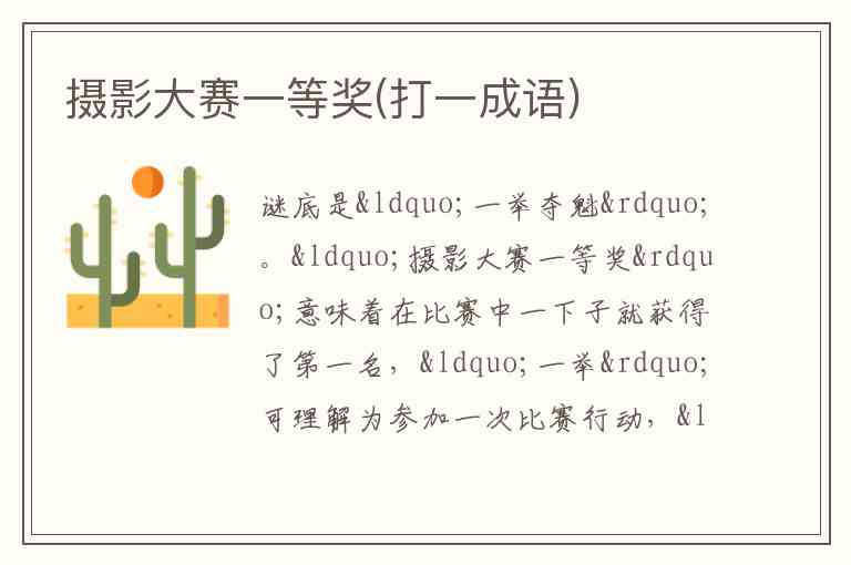“摄影大赛一等奖”意味着在比赛中一下子就获得了第一名,“一举”可理解为参加一次比赛行动,“夺魁”就是夺得冠军、获得第一名,所以扣合成语“一举夺魁” 。