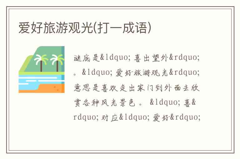 “爱好旅游观光”意思是喜欢走出家门到外面去欣赏各种风光景色 。 “喜”对应“爱好”,体现喜欢的意思;“出”对应出门去旅游;“望外”对应到外面看不同的景象,所以扣“喜出望外”这个成语。