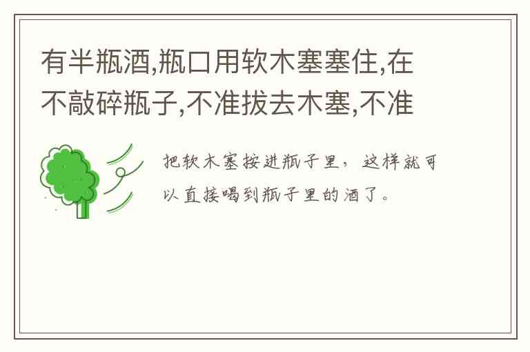 有半瓶酒,瓶口用软木塞塞住,在不敲碎瓶子,不准拔去木塞,不准在塞子上钻孔的情况下,怎样喝到瓶子里的酒?