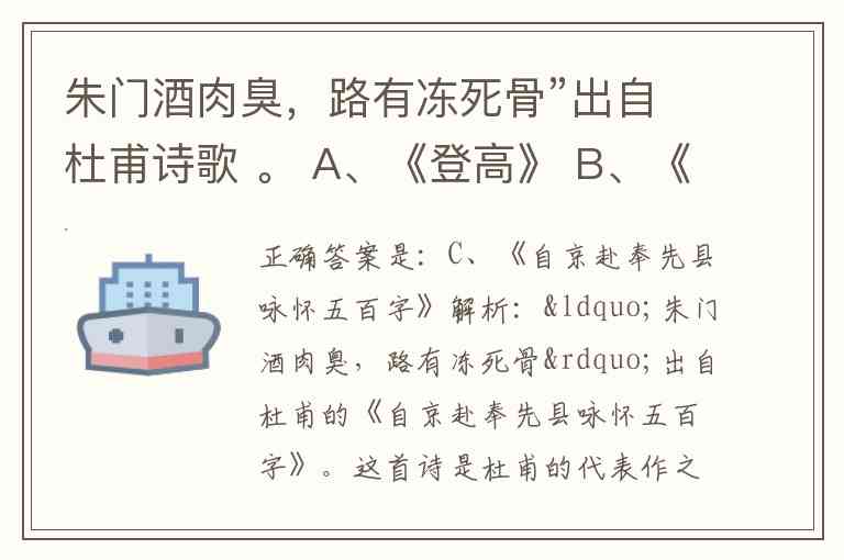 解析:“朱门酒肉臭,路有冻死骨”出自杜甫的《自京赴奉先县咏怀五百字》。这首诗是杜甫的代表作之一,深刻反映了唐朝安史之乱前社会的贫富悬殊和阶级矛盾。诗句通过对比富贵人家的奢侈浪费与贫苦百姓的饥寒交迫,揭露了社会的不公,体现了杜甫忧国忧民的情怀。