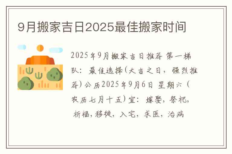 2025年9月搬家吉日推荐 第一梯队:最佳选择(大吉之日,强烈推荐)