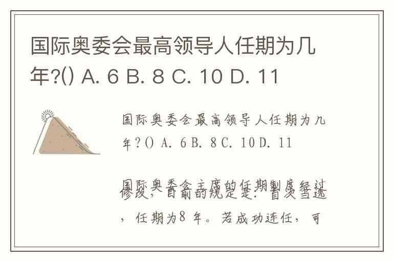 国际奥委会最高领导人任期为几年?() A. 6 B. 8 C. 10 D. 11国际奥委会主席的任期制度经过修改,目前的规定是: