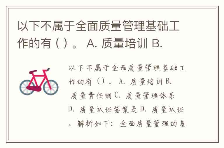 以下不属于全面质量管理基础工作的有 ( ) 。 A. 质量培训 B. 质量责任制 C. 质量管理体系 D. 质量认证