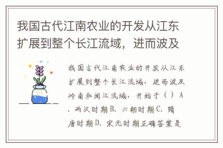 开发进程: 在此推动下,农业开发从传统的江东地区,向整个长江流域(中上游)拓展,并且开始进入岭南和闽江流域。因此,题目中描述的“从江东扩展到整个长江流域,进而波及岭南和闽江流域”的过程,正是始于六朝时期。