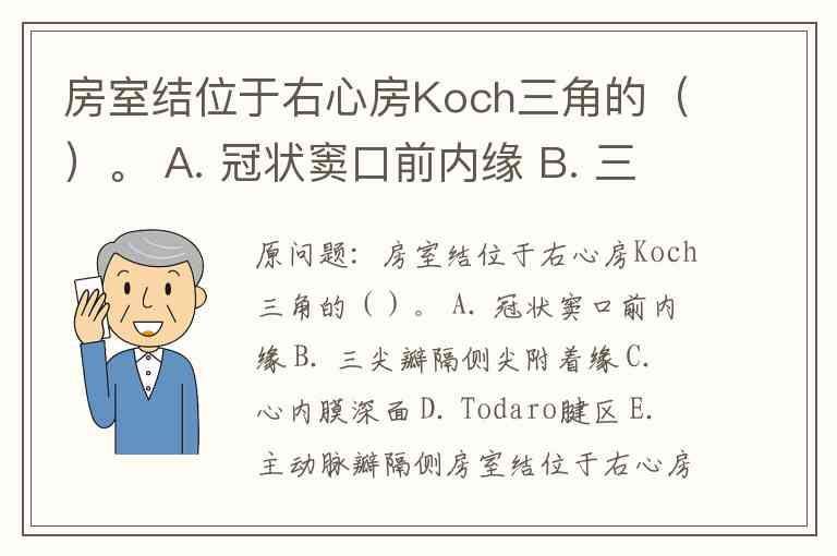 原问题:房室结位于右心房Koch三角的()。 A. 冠状窦口前内缘 B. 三尖瓣隔侧尖附着缘 C. 心内膜深面 D. Todaro腱区 E. 主动脉瓣隔侧