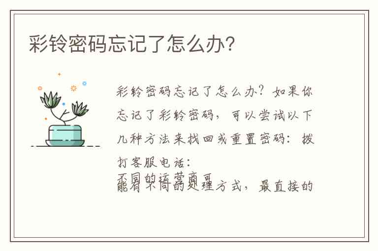 如果你忘记了彩铃密码,可以尝试以下几种方法来找回或重置密码: