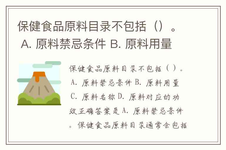 保健食品原料目录不包括()。 A. 原料禁忌条件 B. 原料用量 C. 原料名称 D. 原料对应的功效