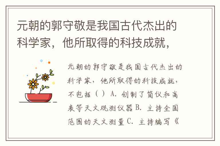 元朝的郭守敬是我国古代杰出的科学家,他所取得的科技成就,不包括() A. 创制了简仪和高表等天文观测仪器 B. 主持全国范围的天文测量 C. 主持编写《授时历》 D. 用科学方法实测地球子午线的长度