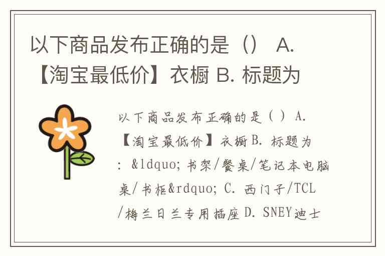 以下商品发布正确的是() A. 【淘宝最低价】衣橱 B. 标题为:“书架/餐桌/笔记本电脑桌/书柜” C. 西门子/TCL/梅兰日兰专用插座 D. SNEY迪士尼靠垫