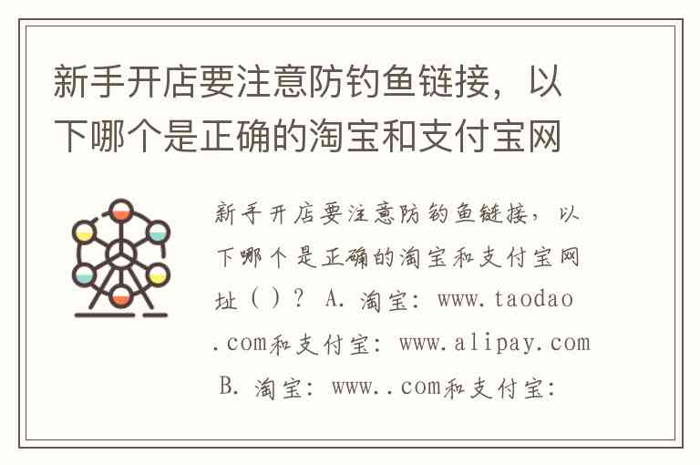 新手开店要注意防钓鱼链接,以下哪个是正确的淘宝和支付宝网址()? A. 淘宝:www.taodao.com和支付宝:www.alipay.com B. 淘宝:www..com和支付宝:www.alipoy.com C. 淘宝:www..com和支付宝:www.alipay.com D. 淘宝:www..com和支付宝:www.ailpays.com