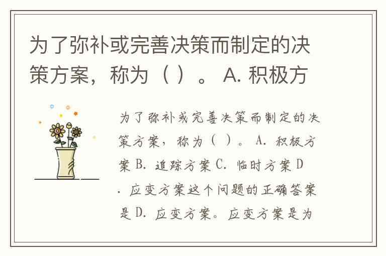 为了弥补或完善决策而制定的决策方案,称为( )。 A. 积极方案 B. 追踪方案 C. 临时方案 D. 应变方案