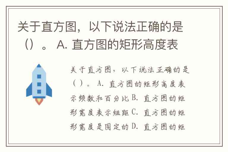 关于直方图,以下说法正确的是()。 A. 直方图的矩形高度表示频数和百分比 B. 直方图的矩形宽度表示组距 C. 直方图的矩形宽度是固定的 D. 直方图的矩形通常是分开排列 E. 直方图的矩形通常是连续排列