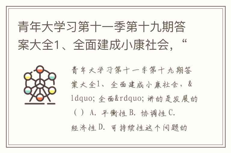 青年大学习第十一季第十九期答案大全1、全面建成小康社会,“全面”讲的是发展的() A. 平衡性 B. 协调性 C. 经济性 D. 可持续性