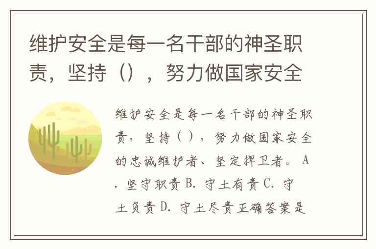 维护安全是每一名干部的神圣职责,坚持(),努力做国家安全的忠诚维护者、坚定捍卫者。 A. 坚守职责 B. 守土有责 C. 守土负责 D. 守土尽责