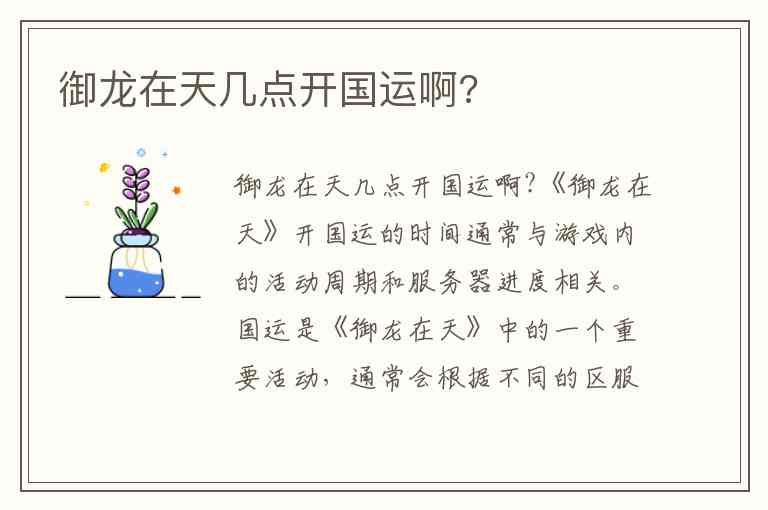 《御龙在天》开国运的时间通常与游戏内的活动周期和服务器进度相关。国运是《御龙在天》中的一个重要活动,通常会根据不同的区服和活动安排,具体开国运的时间也会有所不同。