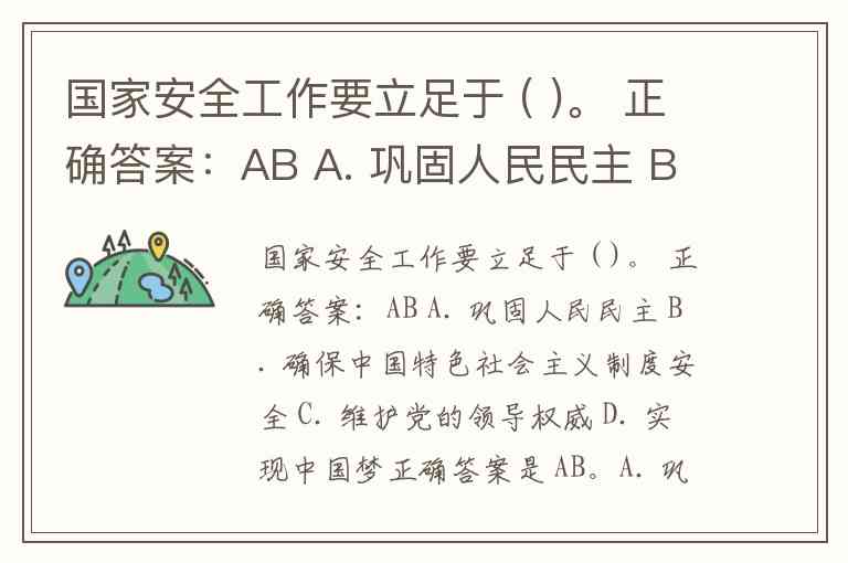 国家安全工作要立足于 ( )。 正确答案:AB A. 巩固人民民主 B. 确保中国特色社会主义制度安全 C. 维护党的领导权威 D. 实现中国梦