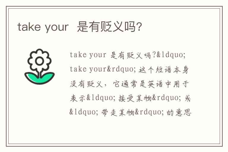 “take your”这个短语本身没有贬义,它通常是英语中用于表示“接受某物”或“带走某物”的意思。例如,“Take your time”(不急)或者“Take your umbrella”(带上你的伞)。但如果它出现在特定语境下,可能会有不同的感情色彩。