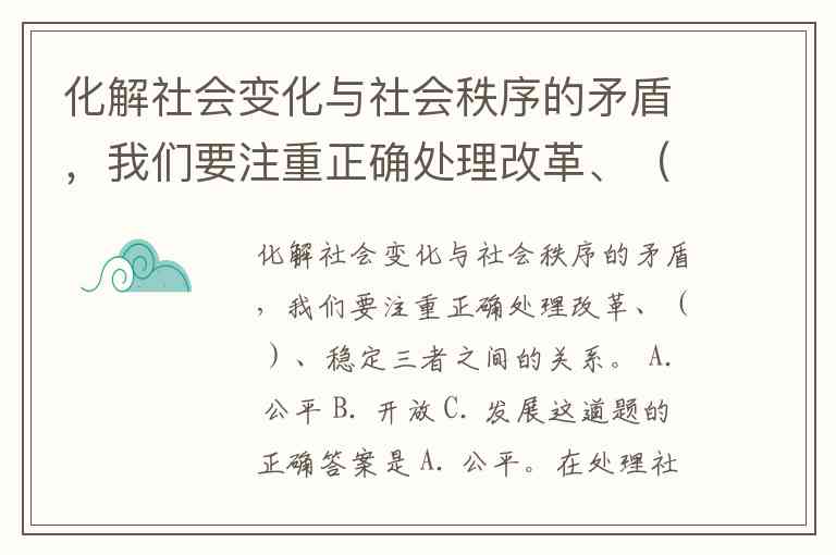 化解社会变化与社会秩序的矛盾,我们要注重正确处理改革、( )、稳定三者之间的关系。 A. 公平 B. 开放 C. 发展