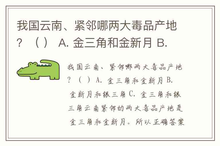 我国云南、紧邻哪两大毒品产地?( ) A. 金三角和金新月 B. 金新月和银三角 C. 金三角和银三角