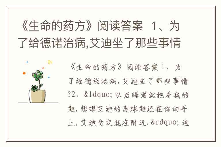 《生命的药方》阅读答案 1、为了给德诺治病,艾迪坐了那些事情?2、“以后睡觉就抱着我的鞋,想想艾迪的臭球鞋还在你的手上,艾迪肯定就在附近.”这句话是艾迪对德诺说的,请结合艾迪说这句话时的语言环境,3读完本文后,你明白“生命的药方”到底是什么吗?
