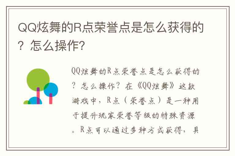 在《QQ炫舞》这款游戏中,R点(荣誉点)是一种用于提升玩家荣誉等级的特殊资源。R点可以通过多种方式获得,具体操作方法如下: