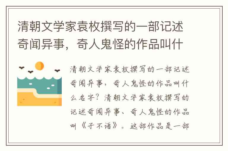 清朝文学家袁枚撰写的记述奇闻异事、奇人鬼怪的作品叫《子不语》。这部作品是一部短篇小说集,内容充满了怪异、神秘和奇异的故事,涵盖了各种超自然现象、奇人异事、鬼怪传说等。通过这些故事,袁枚展示了他对奇异事物的浓厚兴趣,以及他对人性、社会和道德的独特观察和思考。