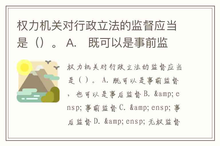 权力机关对行政立法的监督应当是()。 A. 既可以是事前监督,也可以是事后监督 B. 事前监督 C. 事后监督 D. 无权监督