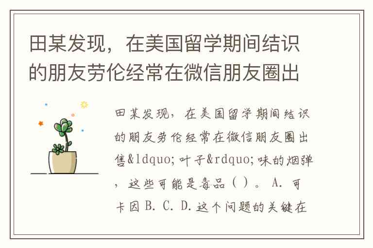 田某发现,在美国留学期间结识的朋友劳伦经常在微信朋友圈出售“叶子”味的烟弹,这些可能是毒品()。 A. 可卡因 B. C. D.
