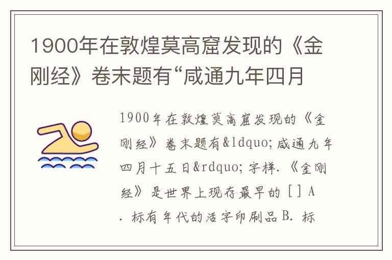 1900年在敦煌莫高窟发现的《金刚经》卷末题有“咸通九年四月十五日”字样.《金刚经》是世界上现存最早的 [ ] A. 标有年代的活字印刷品 B. 标有年代的雕版印刷品 C. 隋代初年留存的印刷品 D. 北宋时期的佛经印刷品