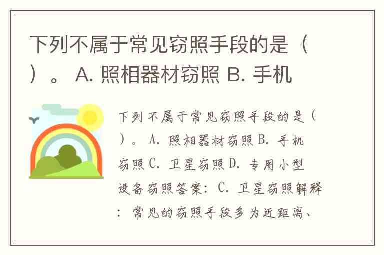 解释:常见的窃照手段多为近距离、隐蔽拍摄——使用照相器材、手机或专用小型隐蔽设备(例如针孔摄像头、笔形/眼镜式摄像头)等。卫星影像属于高空遥感,分辨率、时效性、成本和法律限制都不适合用于一般意义上的“窃照”(对个人或室内进行隐蔽拍摄),因此不属于常见手段。
