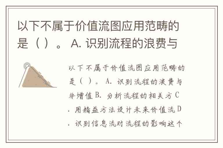 以下不属于价值流图应用范畴的是( )。 A. 识别流程的浪费与非增值 B. 分析流程的相关方 C. 用精益方法设计未来价值流 D. 识别信息流对流程的影响