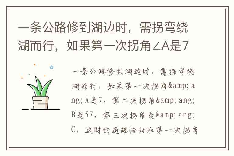 一条公路修到湖边时,需拐弯绕湖而行,如果第一次拐角∠A是7,第二次拐角∠B是57,第三次拐角是∠C,这时的道路恰好和第一次拐弯之前的道路平行,则∠C的度数是( ) A. 7 B. 57 C. 7 D. 47