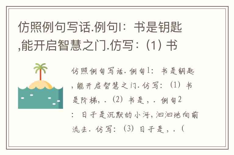 仿照例句写话.例句l:书是钥匙,能开启智慧之门.仿写:(1) 书是阶梯, . (2) 书是 , . 例句2:日子是沉默的小河,汩汩地向前流去. 仿写:(3) 日子是 , . (4) 日子是 , .