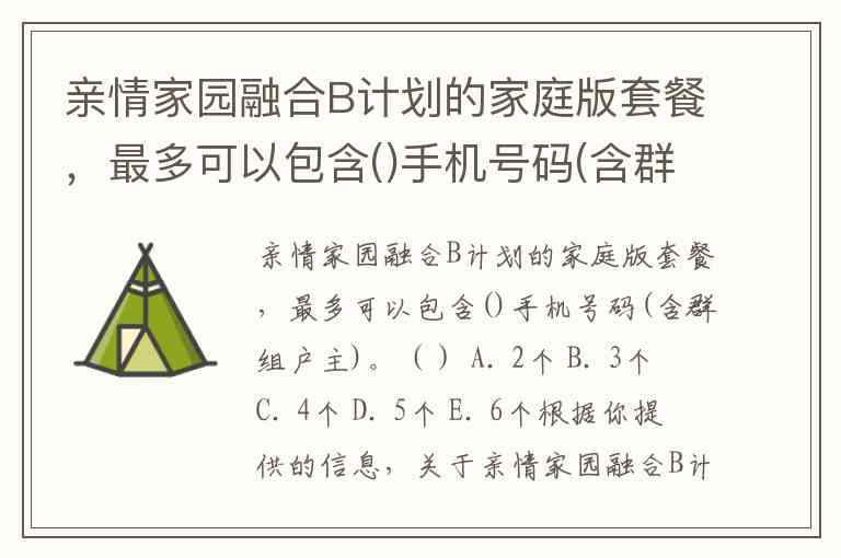 根据你提供的信息,关于亲情家园融合B计划的家庭版套餐,最多可以包含多少个手机号码(含群组户主),这个问题的答案通常需要参考运营商的具体套餐规定。一般来说,类似的家庭套餐常常支持多达5个手机号码。