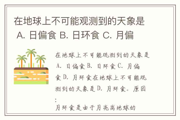 在地球上不可能观测到的天象是 A. 日偏食 B. 日环食 C. 月偏食 D. 月环食
